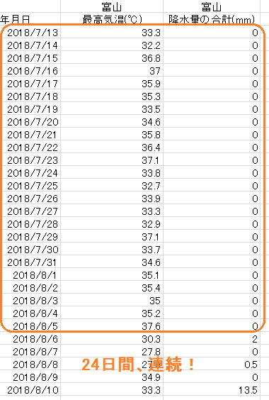 7月13日から8月5日までの24日間、気温30度以上、降水量ゼロが続いたことが記録され・・・